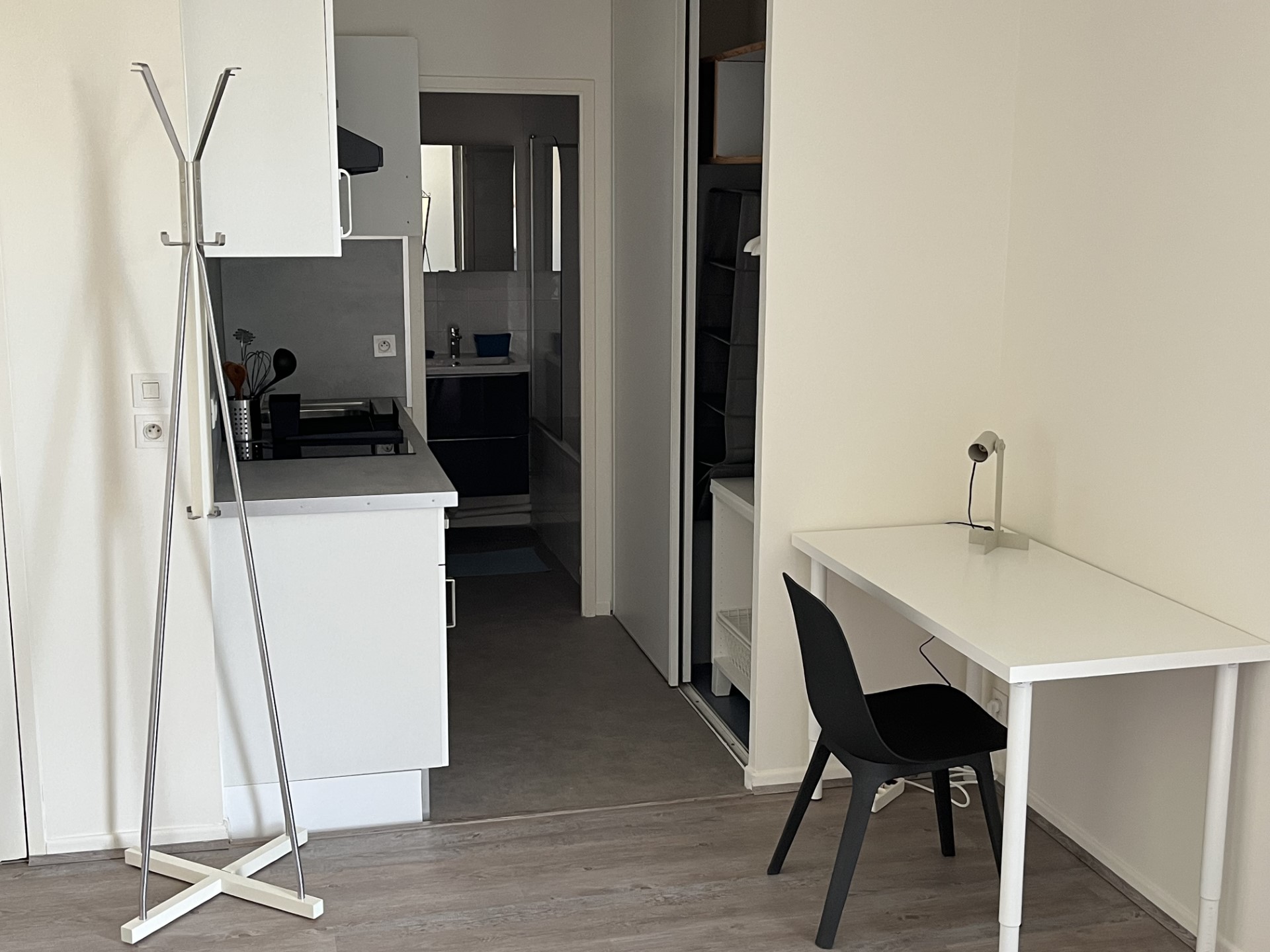 1 canapé-lit, 1 couette,1 housse de couette grise,2 taies d’oreiller grises,2 protèges oreiller blanc, 2 oreillers,1 alèse 1 table basse 3 chaises 1 table bureau avec pieds réglables 1 grand miroir, 1 grande lampe,1 grand tapis,1 plafonnier1 porte-manteau,1 lampe de bureau,1 petit meuble rangement dans placard, 1 rangement 4 compartiments gris, 1 micro-onde + four ,1 couvercle pour micro-onde
